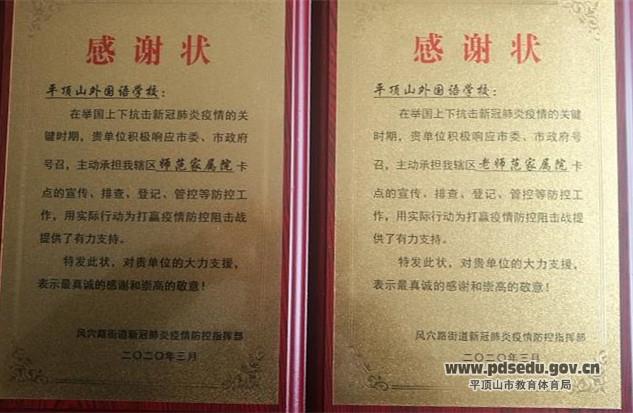 3月21日上午,平顶山外国语学校收到了两块沉甸甸的感谢状。这是外国语学校所在辖区汝州市风穴路街道新冠肺炎疫情防控指挥部为感谢学校的两个家属院卡点在疫情防控工作中做出的突出贡献,为辖区打赢疫情防控阻击战提供大力支援而专门通过快递邮寄过来的。