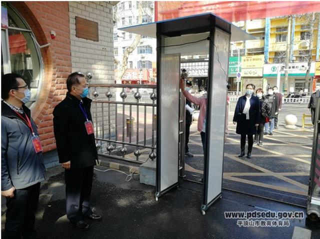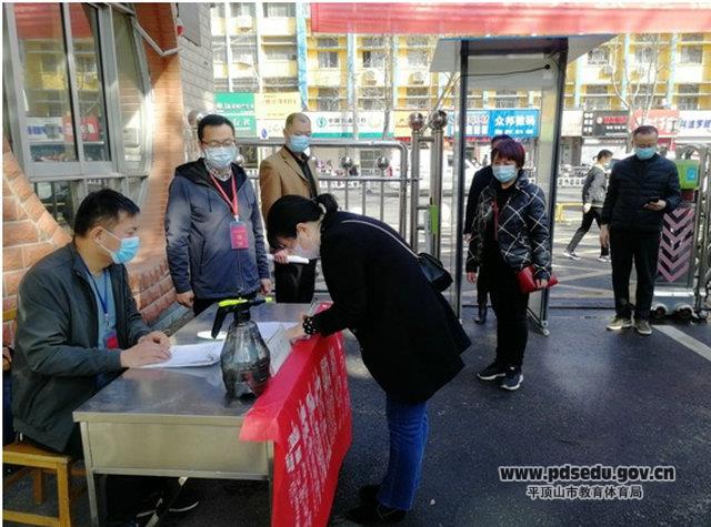 参演人员迅速在学校大门外按间距1.5米排队集结,等待检查进校。他们在值班人员的指导下,一个一个的在“非接触式体温筛查仪”测量体温、在登记处进行信息登记,然后进入校园……