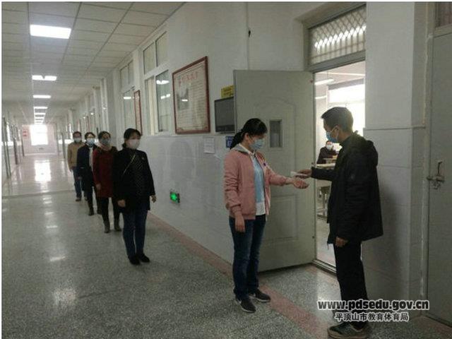 一名教师手持额温枪站在教室门口,所有“学生”按要求有序排队,待老师测量体温后,进入教室……