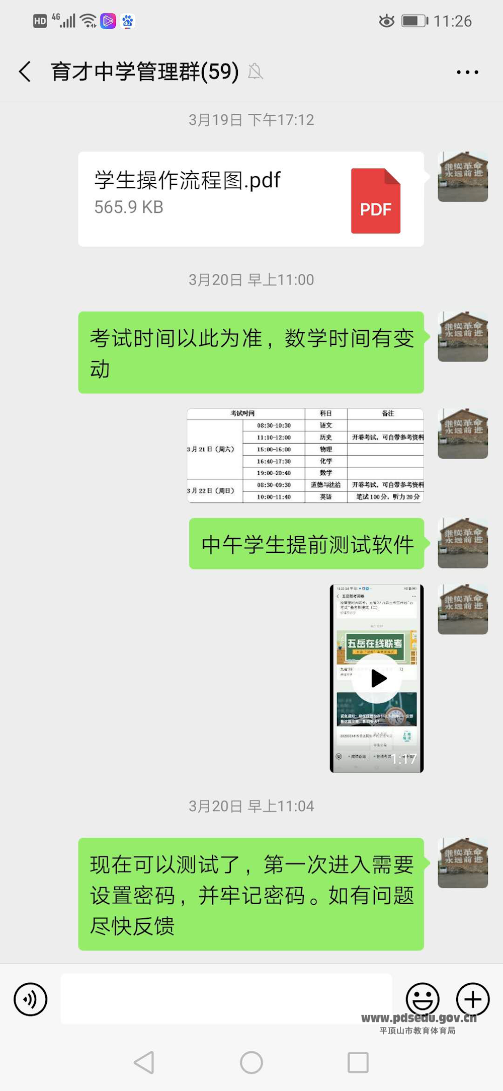 考试前两天,学校教务处召开九年级教师视频会议,布置此次线上考试工作,并对如何利用微信、钉钉和五岳考试平台进行考试、阅卷进行了培训。本次考试采用线上发送试卷、规定时间内线下答题、拍照上传的方式进行。