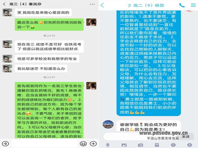 高三(6)班心里观察员、心之声社团社长王笑笑同学,主动加入志愿者队伍,秉承“爱心助人”的宗旨,在线上给同学们做心理疏导工作。