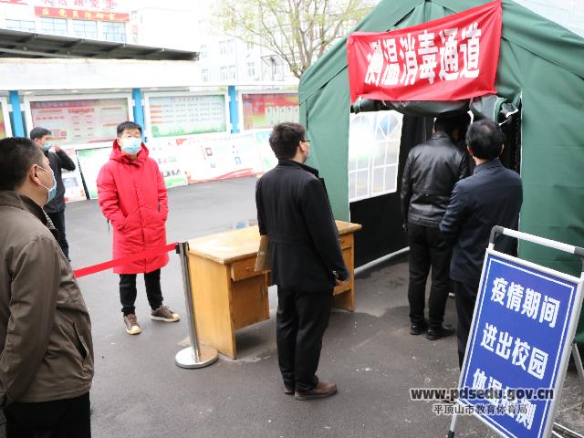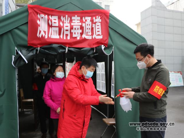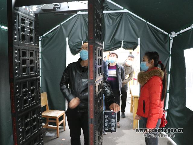 会后,在校长邢朝辉的具体指导下,主要演练了学生入校环节。参加演练人员模拟学生排好队伍,依次进入测温消毒通道帐篷内,在检测人员校医张智琴的指导下,伸出左手,露出手腕,放置于测温仪器探测孔上方5厘米处,测温门上方显示出模拟人员体温,如有发烧,会报警提示。测温门还有检测是否带有金属危险物品的功能。体温和安全检测过关后,步出帐篷时,地上还有消毒地垫,可以对鞋子底部进行消毒。检测人员还会往模拟人员手上喷洒酒精进行消毒。