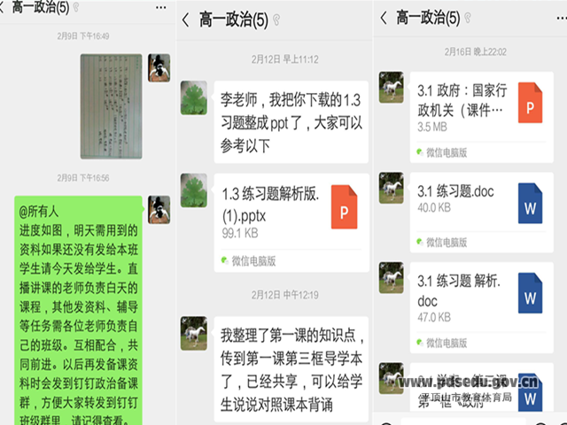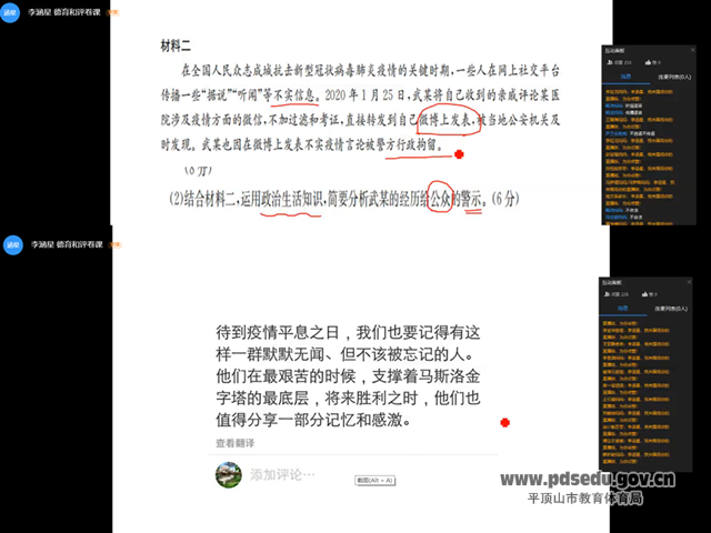 寒假开始前政治组就已经在教学会议上确定了集体备课采用分工协作的方法,并对备课的任务进行了分配。四中的数字化平台也为在家办公教学提供了极大便利。开学时间延迟后,政治组迅速反应,安排直播教师到岗完成教学任务,答疑时间则以直播、语音、平台作业辅导等形式各自负责辅导自己所教的班级,解答学生的个性化问题,并展示优秀作业,鼓励鞭策学生自觉自律。