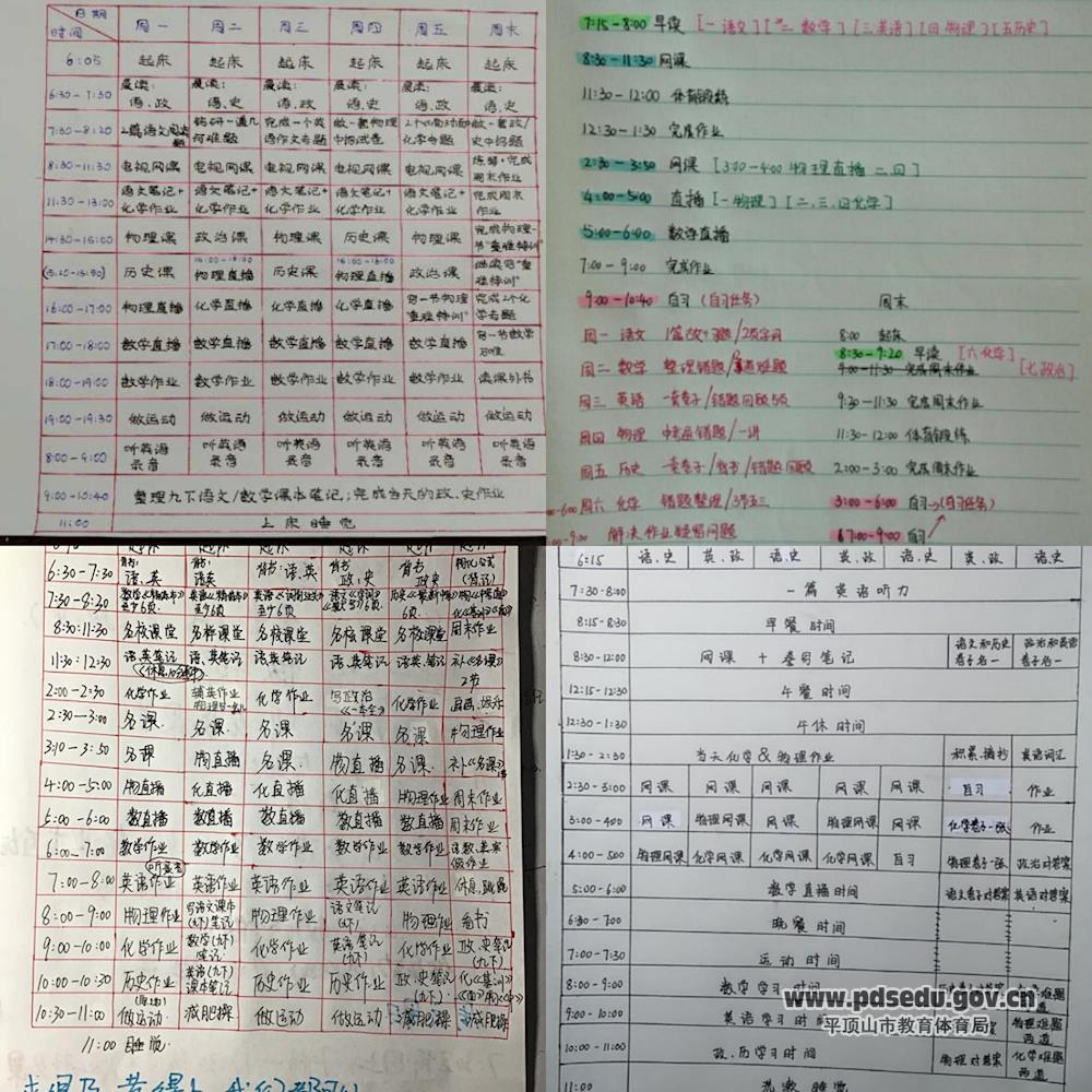 接到任务后,九年级班主任们积极行动,着手准备有关工作事宜,比如九年级5班班主任郑跃罡老师为更好衔接开学教学工作,在线上模拟考试之前就向学生布置完成“开学前计划学习作息表”,让学生能产生紧迫感,增加学习动力,科学高效的居家学习,同时动员家长参与日常的监督陪伴。