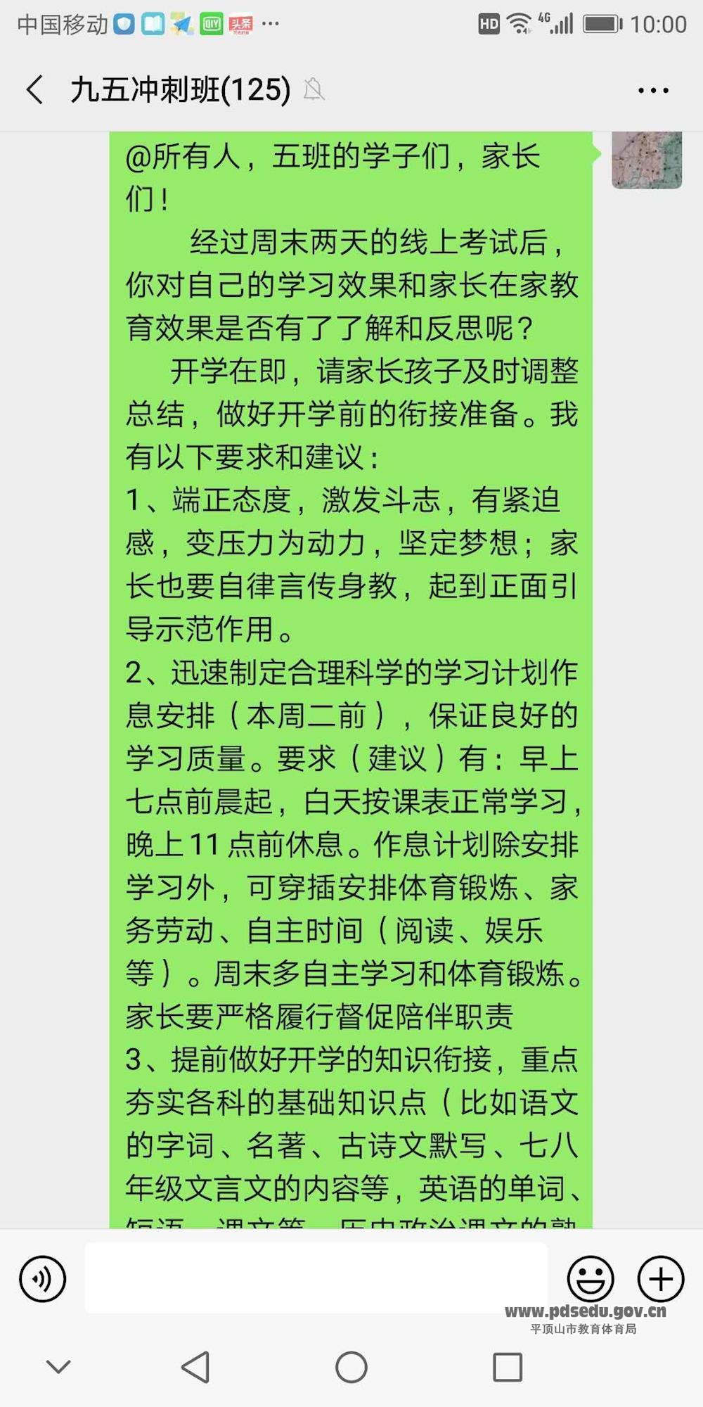 周三(3月25日)线上成绩揭晓后,九年级各班主任及时发布信息。进行成绩分析和有关准备,与本周内在各班微信群或“钉钉”群内开展了一次“中考线上家长班会”。会上,班主任首先进行了客观的成绩分析,又对前一段的居家学习情况进行了总结,肯定好的现象和状态较好的学生,指出问题和不足;还对家长、孩子分别提出开学前的要求:家长要发挥良好的榜样示范作用,营造良好的家庭氛围,加强督导孩子学习质量,及时疏导孩子焦躁心理,防止孩子过于放松懒散,帮助孩子体育锻炼;学生要端正态度,调整好情绪,树立中招意识,学会时间管理,增加自律主动意识,学会科学高效地学习。