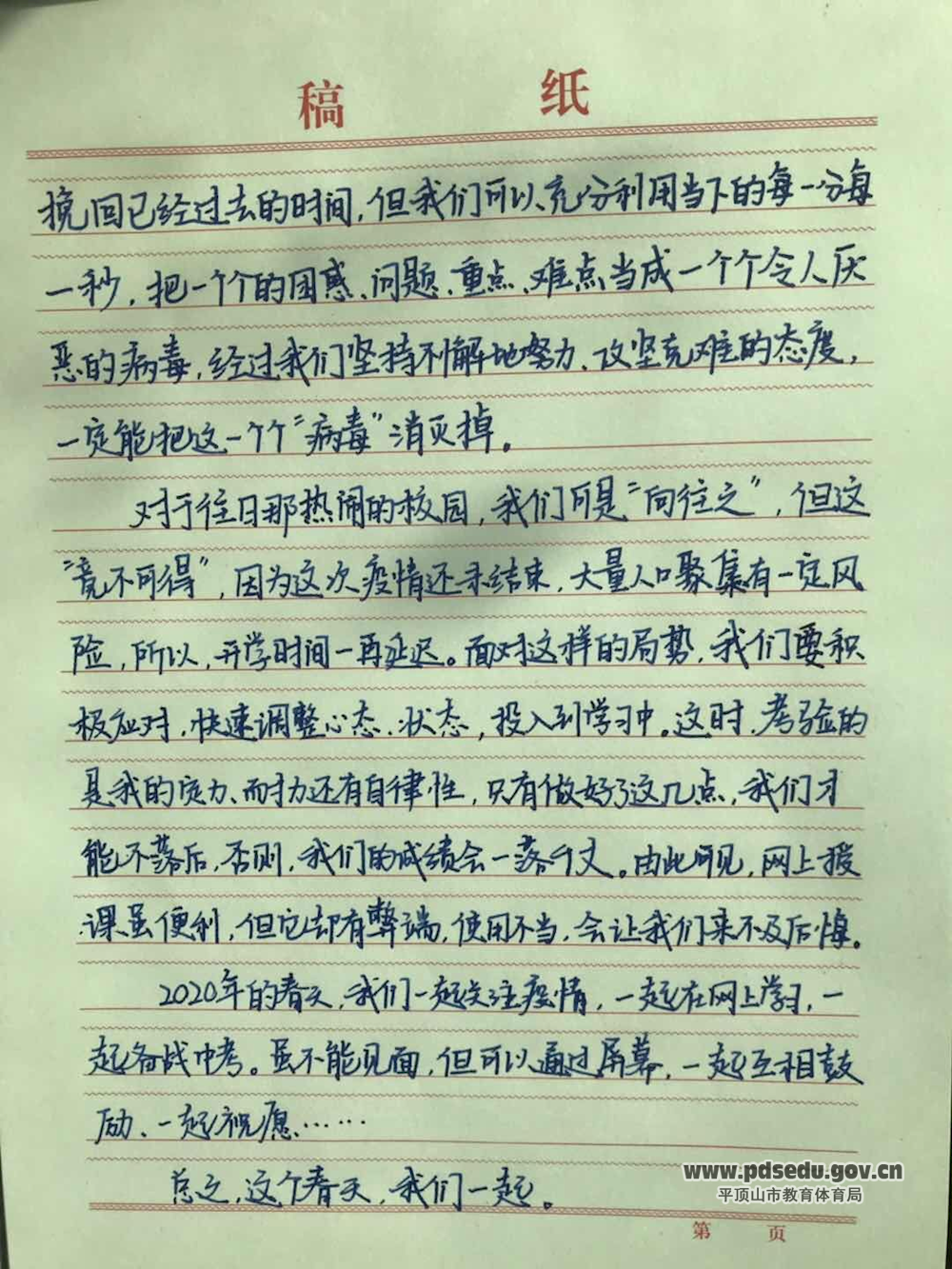 学校九年级师生采用了书信的形式抒发自己的爱国情感,一封封充满真挚感情的书信,传达了他们对逆行者的敬意和祝福,同时也纷纷表示自己要上好网课,按时完成作业,用自己的实际行动彰显着自己爱国情。