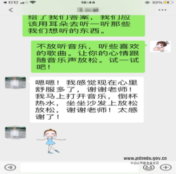春风姐姐——疫情期间,组内健康安全的老师们也不敢稍加松懈。通过直播、小视频、微信等方式及时向学生宣传安全防护知识,科学抗疫,如“七步洗手法”“如何正确佩戴口罩”等。居家期间,面对学习环境的变化,学习方式的转变,以及对疫情的担心和长期的居家环境的不适应,一部分学生产生了压抑和焦躁情绪,心理健康老师张园园和苏春黎在得知这一情况后,马上通过微信、电话对学生进行心理干预和疏导,指导学生正确认识自己的心境反应,通过转移注意力、听音乐、进行适当的体育锻炼等形式缓解压力,调整良好的心理状态。经过老师的多次疏导,学生恢复了阳光和自信,又以饱满的精神投入到网络学习中。