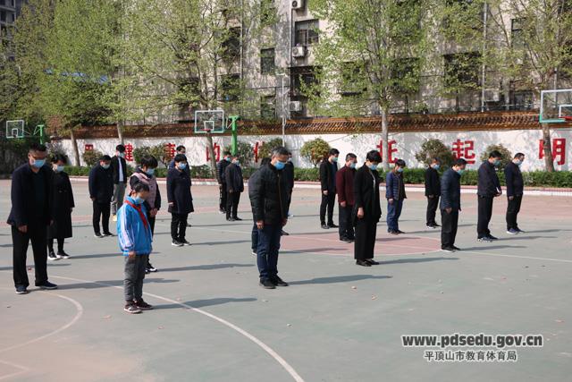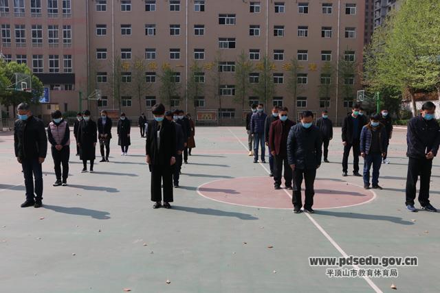 4月4日上午九点多,市十二中部分老师自发到校,10点整防空警报鸣响,孙新志校长带领老师们面对国旗降半旗默哀3分钟。大家神情凝重,哀思充满心间,深切哀悼抗击新冠肺炎疫情斗争中牺牲烈士和逝世同胞。