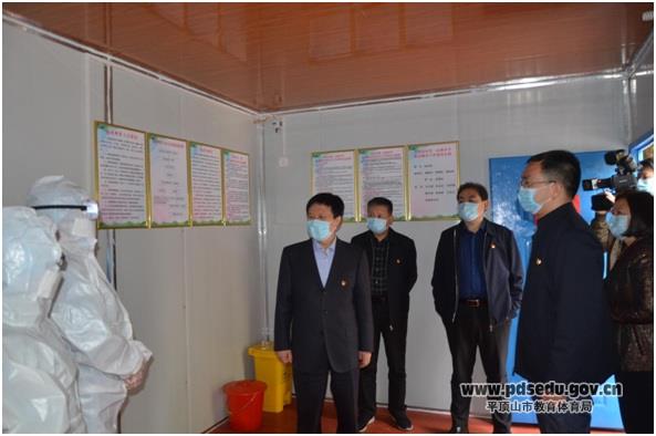 视察中,周斌一进校园就先来到学校设置的临时隔离室,浏览隔离室墙上张贴的各项疫情防控制度,询问校医隔离防控的准备情况,来到学校广场,周斌驻足查看学校新冠病毒防控工作宣传版面上的疫情防控部门责任人一览表和新冠肺炎处置流程图,听取市一高党委书记、校长孙洪涛的疫情防控工作汇报,随后他来到教室,查看教室防控网格、桌椅摆放,到学校防疫物品储备仓库,详细了解医用物资储备情况,在学生餐厅,周斌书记查看餐桌上的分班桌贴,询问如何安排学生错时就餐,在学生公寓,询问入住学生安排,了解隔离宿舍设置。