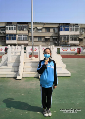 默哀毕,仪式进行第三项:七(2)班学生彭相宜代表全体学生向逝世同胞及烈士致敬!她讲到:“清明时节雨纷纷,路上行人欲断魂。此时此刻,相信大家都怀着无比悲痛的心情,向抗击新冠肺炎疫情斗争牺牲烈士和逝世同胞的深切哀悼......”