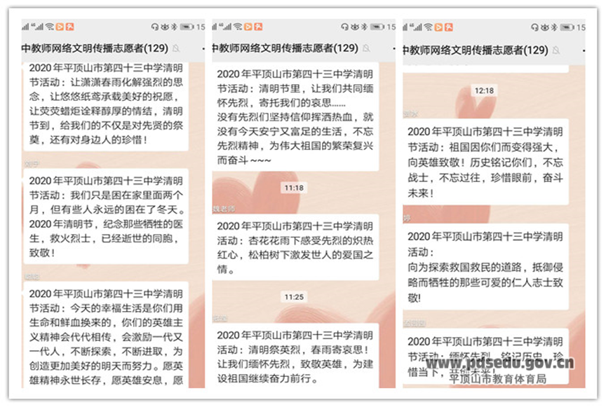 “捐躯赴国难,视死忽如归!今日祭英烈,明朝踏征程。全民共抗疫,神州同前行。一旦阴霾散,赤县尽欢腾!”“今天我们的幸福生活是您们无数英雄用生命交换的,我们不会忘记历史!网上祭英烈,不忘烈士抛忠骨,民族复兴中国梦! ”“一年一清明,一岁一相思,缅怀先烈寄托哀思。清明节,铭记英雄,读懂生命的重量。缅怀英烈祭忠魂,抚今追昔思奋进。”四十三中全体教职工用一条条短信来缅怀先祖、缅怀先烈,弘扬民俗文化。