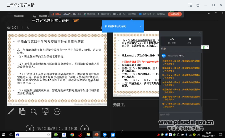 政教处主任陈冰冰通过直播为高三学子上了制度第一节课,他向大家重点解读了学校“三方案九制度”的具体内容,明确各项方案的细则标准,细心叮嘱大家严格执行各类要求,要求大家积极配合学校工作,向模范学习,以实际行动告慰抗疫战士们的辛苦付出。