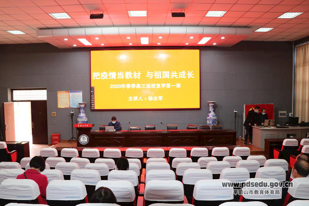 随后,校长杨全军在校讲座厅通过直播的形式向全体师生上了以“把疫情当教材,与祖国共成长”为主题的开学第一课。他声情并茂,带领大家回顾抗疫以来涌现出的诸多感人事迹,希望大家永远铭记那些逆行者的身影。他强调“多难兴邦,玉汝于成”,希望大家以灾难助成长,立爱党爱国爱人民之志,做经天纬地济世之材。最后他祝福高三学子学有所成,待7月载誉而归,并饱含感情为大家朗诵了由河南省广播媒体共同创作的诗歌《长江长江我是黄河》。