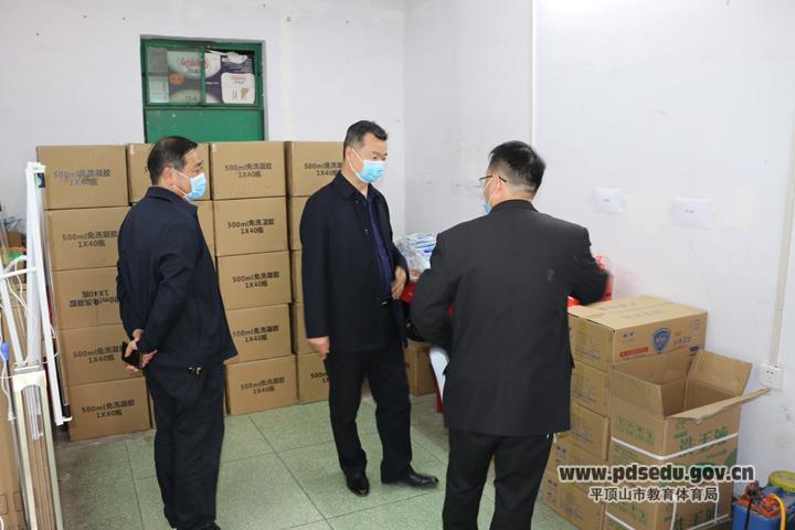 郭志勇一行对校园环境、观察室、隔离室、食堂、物资储备室、厕所、教室等重点区域进行实地考察。每到一处,调研组仔细查看,了解相应防控情况。在市十二中临时观察室和隔离室,郭志勇详细询问学校保健员发现发热情况的有关处理流程;在学校食堂,查看餐桌桌贴,询问如何安排学生错时就餐。在物资储备室,郭志勇重点询问了学校防控物资筹备情况,消毒液、酒精、水龙头、额温枪、口罩等物资的具体数量,仔细查看防疫物资的储备、管理和使用情况。调研组结合九年级学生即将返校复学,学校疫情防控预案、疫情处置流程和复学工作准备等一系列问题与学校领导班子进行深入交流,并就准备工作不够细致到位的地方现场提出整改要求。
