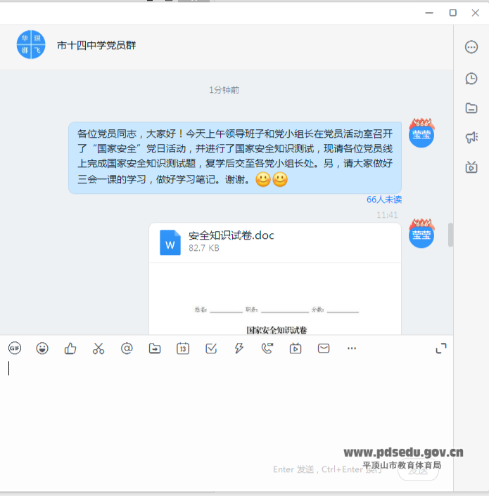 为进一步加强对党员同志的国家安全观教育,提高党员同志的国家安全意识,按照《平顶山市2020年全民国家安全教育日宣传教育活动方案》要求,4月13日,市十四中党支部在党员活动室举行了国家安全主题党日活动。活动通过线上线下相结合的方式开展,由十四中党支部书记刘彩虹主持。