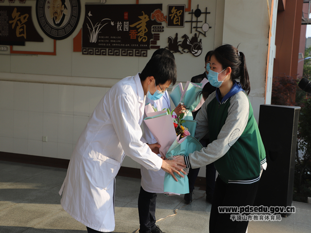 当危险已过,平安将至,这些战斗在防疫一线的最美“逆行者”却要告别校园,重返以前的工作岗位。那些曾经获得过帮助的同学用自己的经历展现驻校医生的深情大义,表达自己内心的感激;与驻校医生工作直接对接的政教处主任陈冰冰作为见证人讲述了三位医生许多不为大家所知的感人细节。怀着不舍、感激和祝福,同学们为三位驻校医生送上鲜花,学校领导也为三位驻校医生颁发了“平顶山市第四中学荣誉职工”证书。