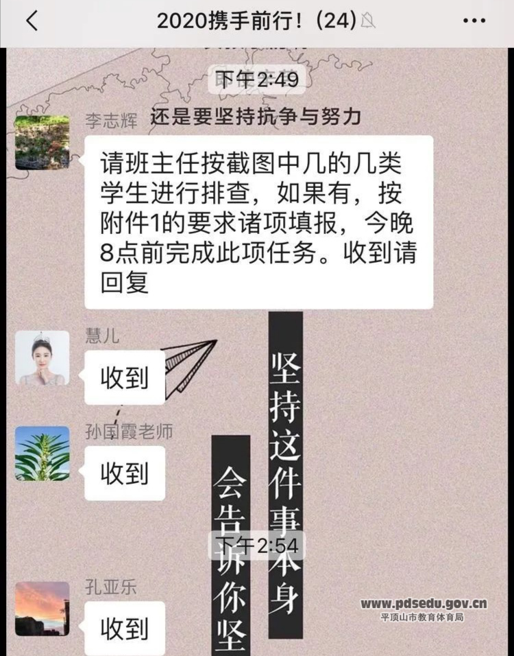 但十五位班主任排除万难,任劳任怨,工作认真细致。刚恩惠、李樱子、杨秋红、宋鲁娟、高晓燕、余桂欣老师高屋建瓴,统筹全班;孙国霞、霍星辰、孔亚乐、王彩霞、何会敏、魏春芳、韩冬梅、何建平、李豪情老师思虑缜密,高质高效。他们为各班网上教学工作的顺利开展提供了有力保障,为他们的敬业精神点赞!