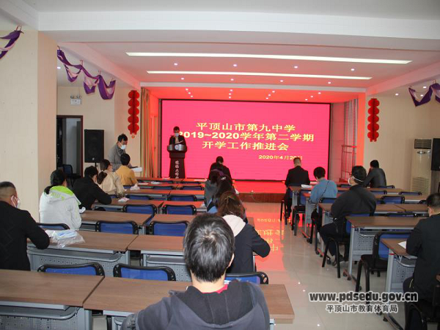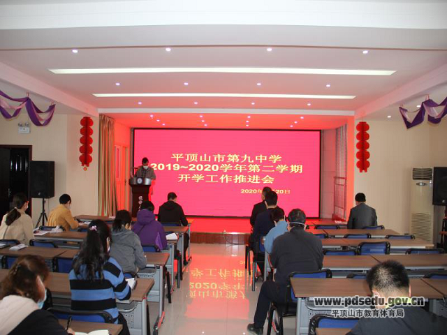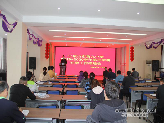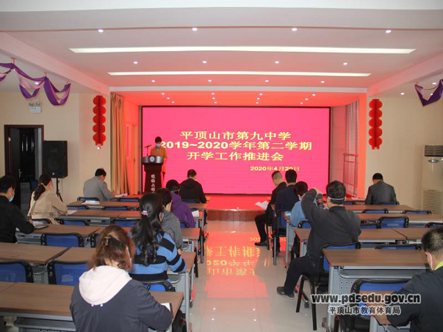 随着河南省疫情防控工作的好转,在省教育厅的部署下,平顶山市教育体育局也明确了初三毕业班具体的开学日期。为确保返校工作安全、平稳、有序地进行,4月20日上午9点,市九中在六楼演播厅召开了2019---2020学年第二学期开学工作推进会。会议主要安排部署了开学前后防疫和开学准备各项工作任务。校领导班子和中层干部参加了此次会议,会议分为五个流程,由副校长王李慧静主持。