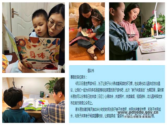 活动前夕,湖光幼儿园通过各年级组老师向家长们发出倡议“让我们一起陪因疫情宅在家里的孩子读书吧”营造浓浓的读书宣教氛围。