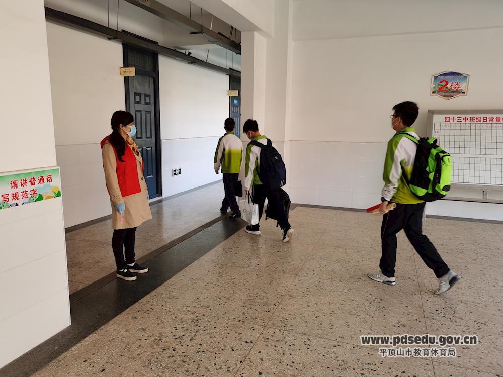 早上7点10分开始,老师、警察、驻校医生、志愿者、保安等工作人员分工明确,迎接学生们“回家”,所有工作按部就班,有条不紊地进行着。各班分批错峰返校,同学们间隔一米以上排队进行体温监测、有序进入校园。九年级八个班430余名同学按规定分别从东、中、西三个楼梯进入班级学习。