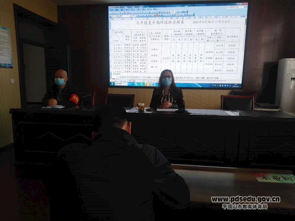 会上,景艳伟校长总结了初三年级第一天返校复学工作中的亮点和不足,一要继续做好学生复学后的复习巩固和新知的教授工作,实行分层教学有针对性推进初三学生复习备考;二要严格落实卫生清洁、消毒工作,对关键部位、关键场所要无死角定时消毒,做好登记;三要严格落实错峰上、下学,值班领导要严把校门口测温关,班主任要严把校内测温关,做好体温登记及问询工作;四所有任课教师要超周备课,适时地对返校学生进行学习评估,有针对性的做好差异化辅导。