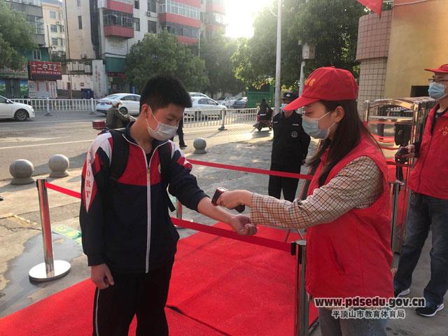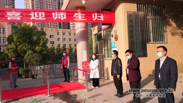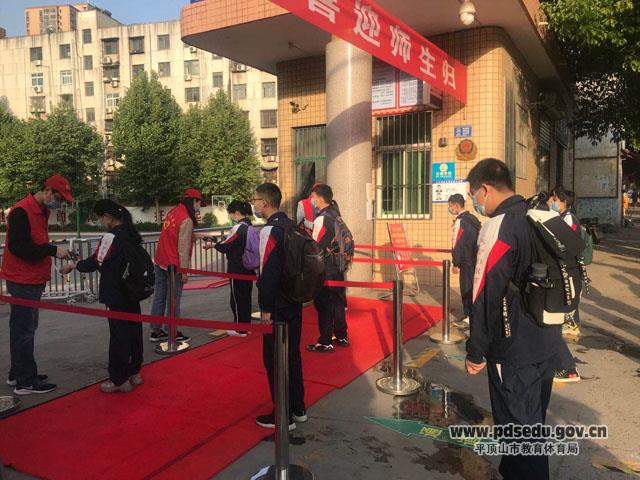 孙新志校长带领校领导班子成员、值班人员在校门口迎接同学们的到来。学生分批排队有序入校,值班人员对学生逐一测量体温。
