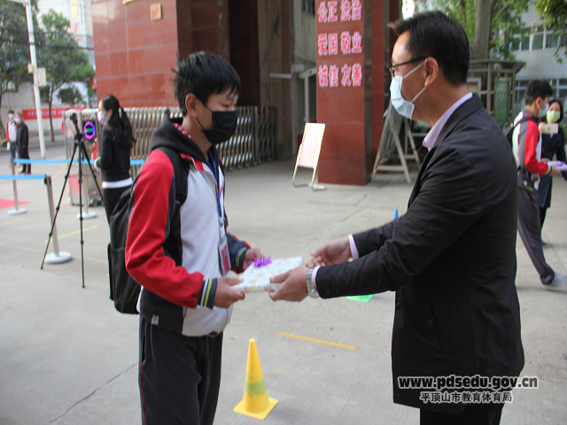 清晨6:40,市九中迎来错峰入学的第一批初三学生,同学们戴着口罩、背着书包高高兴兴地来到学校,通过专用入学通道、经过测温枪检测体温后,在执勤老师、门卫的引导下,安全有序地返回校园,开启了崭新的校园生活。校长耿保峰为老师和学生送上了鲜花和礼物,欢迎他们回归学校。