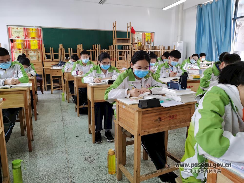 复学期间,为了最大限度保障复学师生的生命健康,四十三中按照市教育体育局的部署将原有的班级分成AB两个班,上课期间单人单座,每人前后左右保持一米间隔,入校、入班需要进行消杀和体温测量,在做好疫情防护的前提下进行课程的学习。