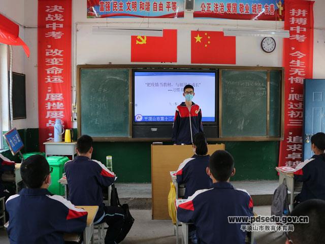 4月29日下午,市十二中九年级以班为单位开展“把疫情当教材,与祖国共成长”习惯养成主题班会,促进十二中学生复学返校后良好习惯养成。