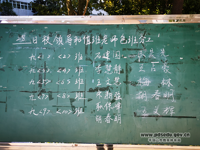 根据平顶山市疫情防控专班的指示精神,4月24日全市初三和中职毕业班学生复学,复学后为了保证九年级学生的学习时间和学习质量,在校长耿保峰的建议下,所有副校级领导干部全天在岗,每位领导干部分包两个班级,要求校级领导进班听课并及时关注分包班级的教学情况、班级管理情况和学生的思想动向;当天值班老师除了正常的值班任务之外,要求当天值班教师坐在分包教室,协助班主任和任课老师进行学生管理。