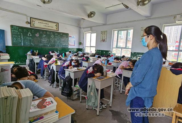 午自习,同学们在休息,青年教师张迎新进班陪伴学生们,确保学生们有充足的休息时间,能更好的去学习。