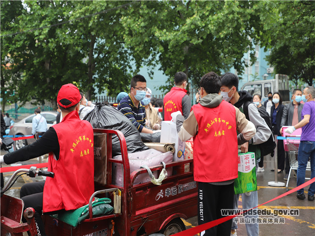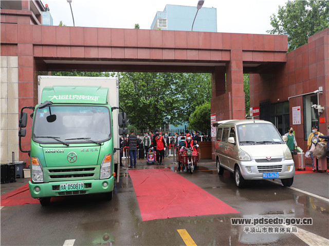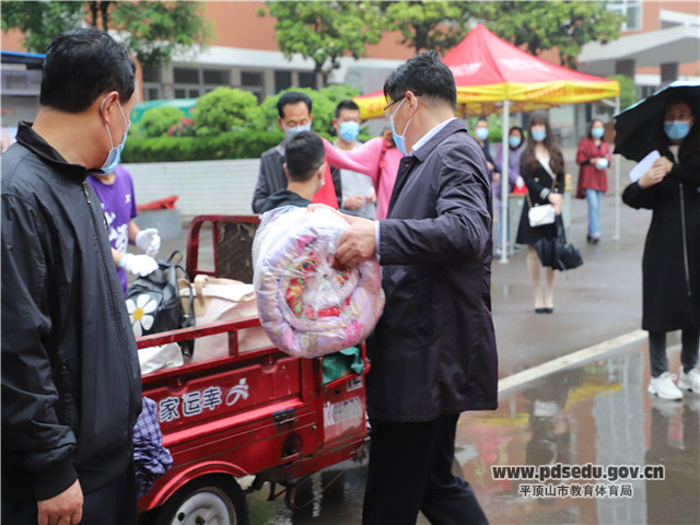考虑到开学行李多、天气状况不好等原因,学校非常贴心地准备了箱式货车、面包车、电三轮、手推车等大大小小的运输工具,帮助同学们运送行李。开学现场,测量体温,场地消杀,行李搬运,人车穿梭,场面热闹,却忙而不乱,秩序井然。这很大程度上得益于学校领导的现场指挥和老师们的志愿服务。他们维持现场秩序、做好交通疏导,提醒学生戴好口罩、保持距离,帮行李多的学生搬运行李,随时处理各种突发状况。