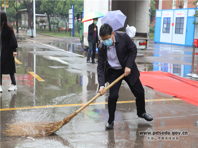 校园内,负责开学工作的教职工也已早早到校,消杀组成员在扫除校门口的积水,并对周边场所进行消杀,为学生入校做着准备。考虑到天气原因为学生和家长带来的不便,在所有参与开学工作的教职工都到位的情况下,学校领导决定提前迎接学生入校。