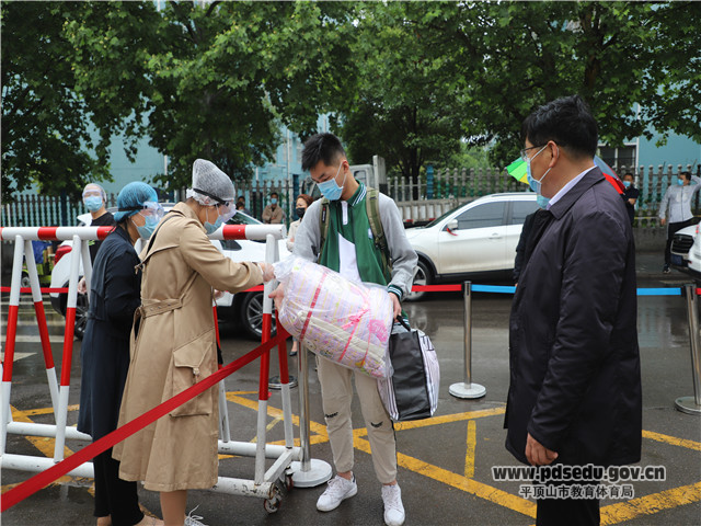 7点20分,负责测量体温的老师为排在第一位的学生测量体温后,校长杨全军从学生手中接过行李,市四中高一高二学生返校复学正式开始。