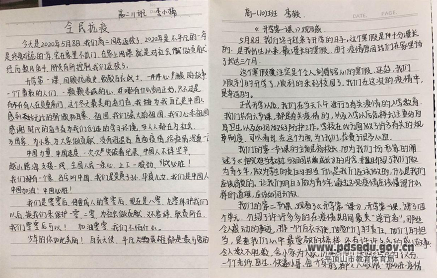 集体活动结束后,各班班主任利用政教处提供的视频资料和课件,并结合同学们在今天复学第一课中所学内容及个人学习生活感受,召开了“每一位都是抗疫英雄”主题班会。班会上一起回顾抗击疫情过程中涌现出的各类感动人物,借此对学生进行生命教育、信念教育和爱国教育,促使学生坚定理想信念、涵养家国情怀、砥砺奋斗精神、坚持人与自然和谐发展理念。同学们深受触动,纷纷拿出纸笔,写出了自己的感想感悟。