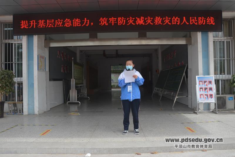 “自2009年起,每年5月12日设为全国防灾减灾日。我们的身边不可避免的存在着各种各样灾害的隐患,如地震,火灾,雷电,交通事故等。灾害确实可怕。但比灾害更可怕的是无知。作为中学生,我们要珍爱生命,最大限度保护自己,就要学习防震减灾知识和避灾自救技能……”九年级学生代表真挚有力的演讲,告诫着大家:《防震减灾,珍爱生命》!珍爱生命,努力增强自我防范能力,时刻注意防灾减灾,做到警钟长鸣是每一位中学生应提高的安全意识。
