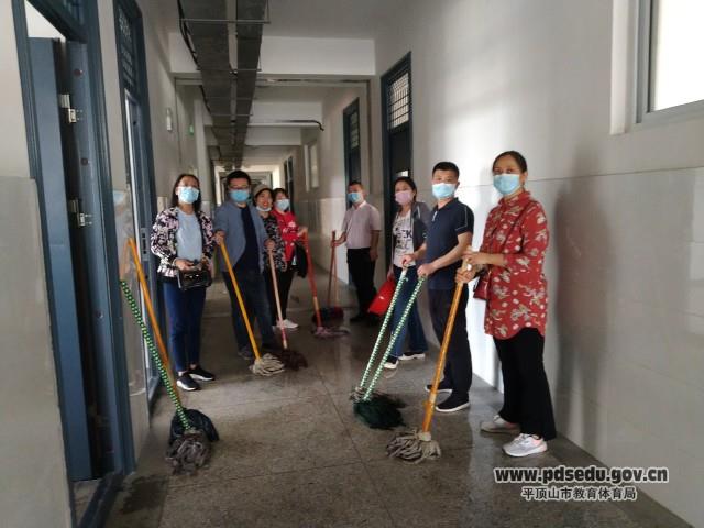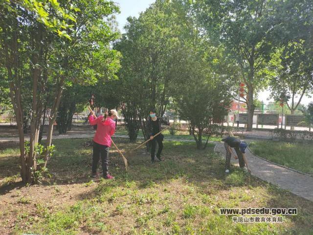 正值孟夏,天气比较炎热,但并不影响教职工们为学生创造安全、舒心校园环境的决心。他们按照任务分工,撸起袖子清扫树叶、去除杂草、擦洗地板,干得热火朝天,不放过任何角落与死角。