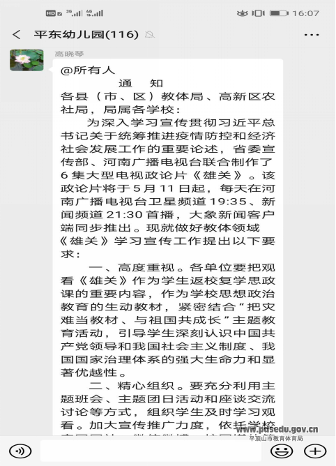 此次活动由园长助理高晓琴组织开展,她在工作群向大家介绍了电视政论片《雄关》的拍摄背景及当前疫情防控取得阶段性胜利的重要意义。她要求全体教职工准时收看《雄关》,并且写出心得体会。