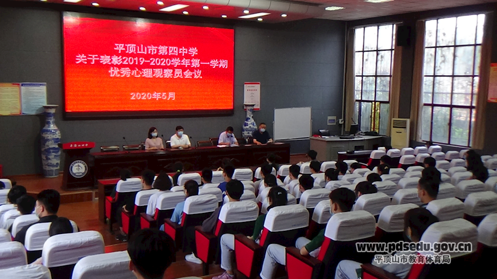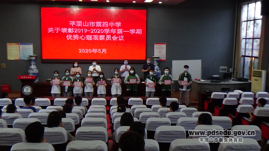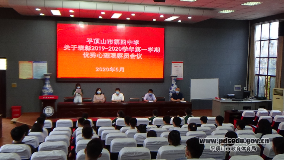 5月21日下午,四中在校讲座厅召开了2019-2020学年优秀心理观察员表彰会,校长杨全军、副校长毛名煜、学生发展中心主任王长领、心理辅导老师程霖、各班心理观察员与学校心之声社团成员参加了本次会议。