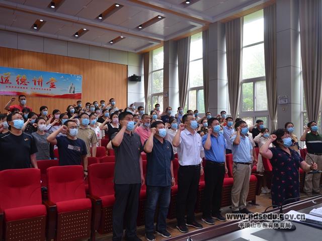 会上,在平顶山市首届学科领雁人才樊歌今的带领下,全体党员举起右手庄严宣誓。党委副书记、副校长李德权结合市教体局党组工作要求布署了学校党建工作,明确了加强党建工作对教育教学的示范引领,加强理论学习、争创“书香校园”,充分发挥党组织战斗堡垒作用、争创红旗党支部等工作重点。