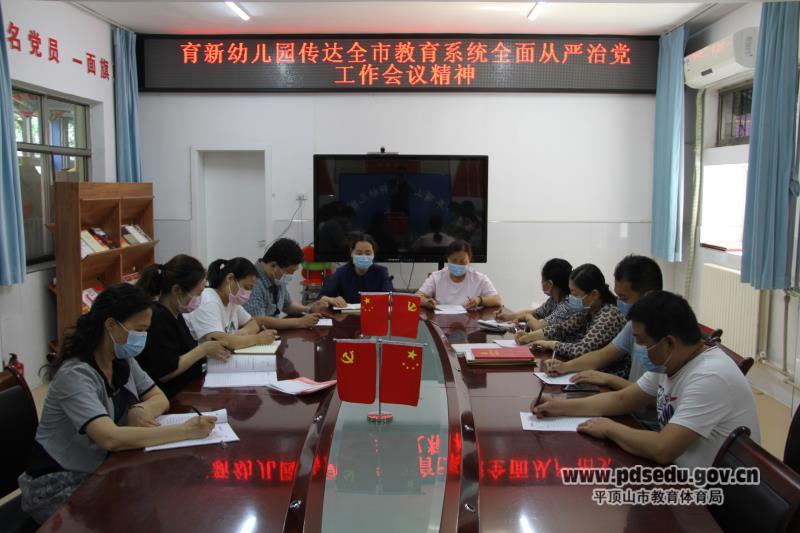 5月21日下午,育新幼儿园在党员活动室学习传达全市教育体育系统全面从严治党工作会议精神。会议由党支部书记裴晓燕主持,班子成员和中层干部参加会议。