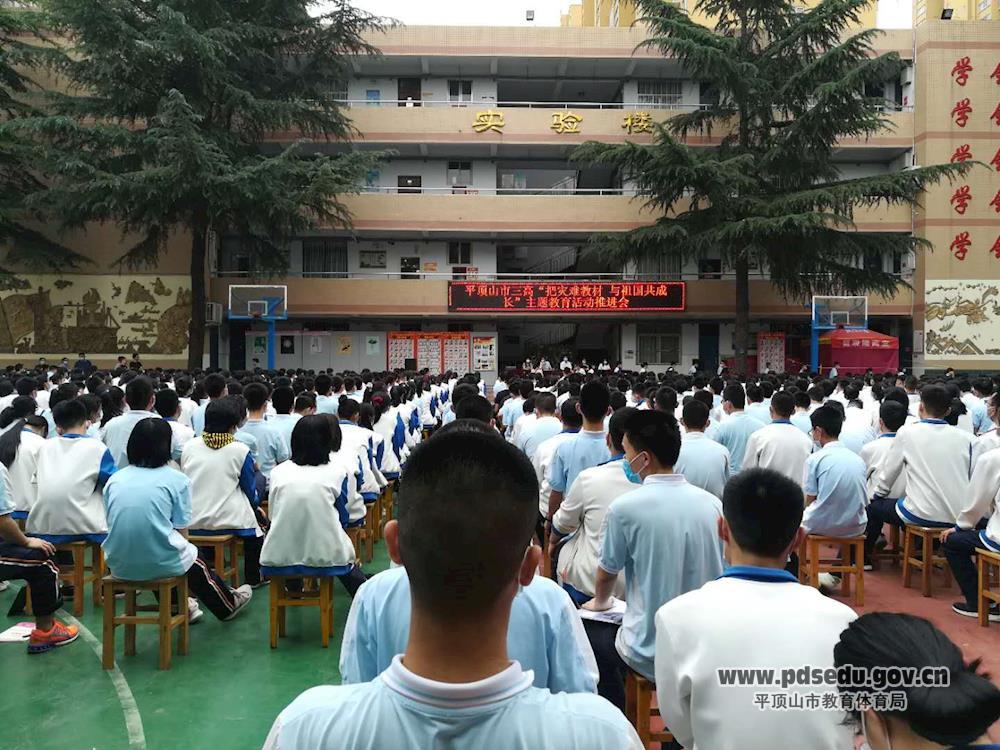 6月2日下午,市三高召开“把灾难当教材 与祖国共成长”主题教育活动推进会,表彰在上学期及疫情防控期间品学兼优的学生,激励广大三高学子坦然面对困难,将疫情做教材,磨练意志,笃定理想,奋起直追,实现弯道超车,筑就人生梦想。市三高名誉校长、平顶山市明骏房地产有限公司董事长杜劲松出席大会,并为获奖学生颁奖。