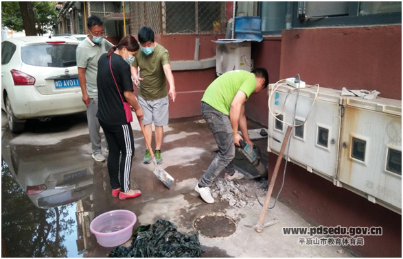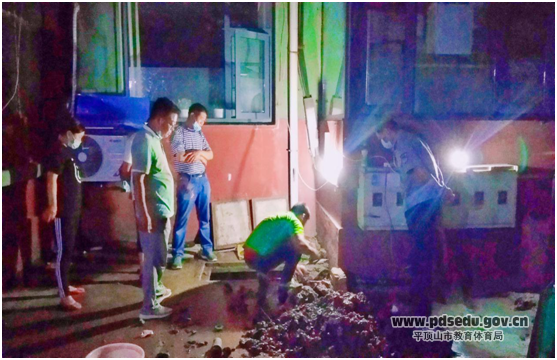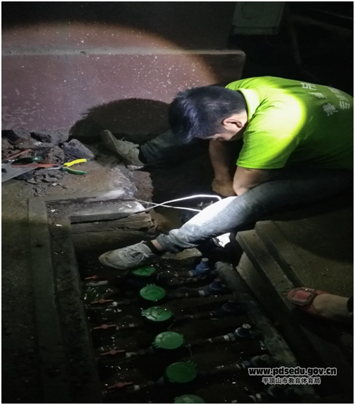 不管值班不值班,他们把日常巡查当做生活习惯。5月27日,家属院4号楼4单元突然出现一滩明水,这样的事情在夏天很容易被人忽略,要么是空调滴水,要么是太阳能维护。而且这滩明水在不起眼的墙角处,很多人并不在意。但正是这容易被忽略的问题被细心的后勤师傅们捕捉到了。他们认真巡查后发现积水表面有很轻微的水流涌动,判断一定是地下管网出现了问题。通过半个小时的紧急排查、测试,终于找到了漏水的位置。为尽快杜绝水资源的浪费,他们决定连夜加班抢修。几个人分头行动,两个人快马加鞭给各单元住户及时通知突发状况需要临时停水,另外两个人紧锣密鼓的准备工具和管件。
