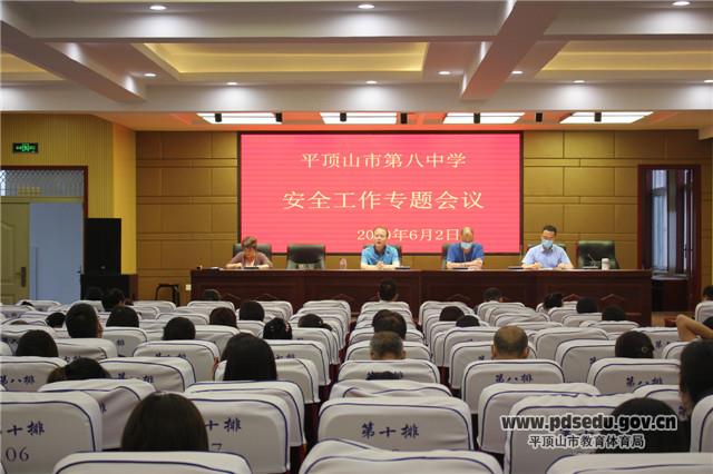 6月2日下午,市八中全体教工在新教学楼五楼报告厅召开校园安全工作会议。