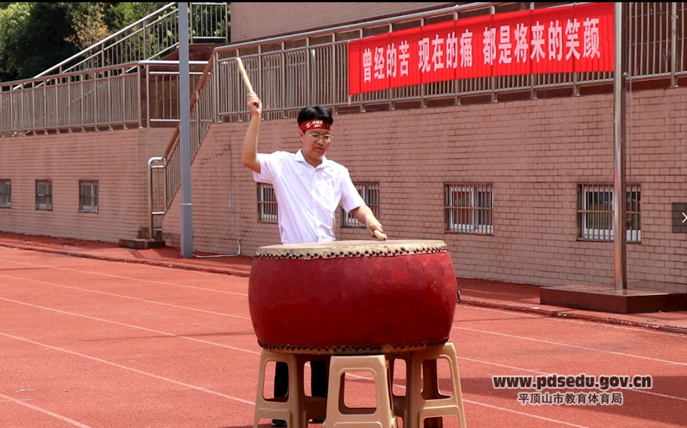 当高三年级主任闫建飞擂响战鼓,大会进入高潮阶段。在震天的鼓声中,高三全体学生佩戴高考必胜的红发带整齐站立,在领誓同学的带领下高声宣誓,他们用铮铮誓言展现决胜高考的勇气和信心,喊出了心中的梦想,喊出了高考必胜的决心。高二高一的学弟学妹们也为高三学子送上了美好祝福。