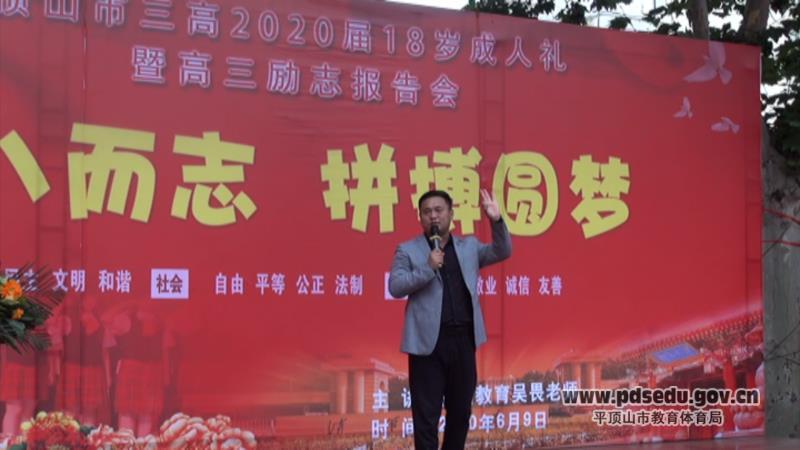 人间最美六月天,且观夏花最绚烂。又是一个怀揣梦想、充满希望的季节,梦想与激情在此点燃!6月10日上午,市三高隆重举行了2020年高考励志报告会。学校特邀中国励志演讲领航者、善朝演讲团金牌讲师演说家吴畏老师为高三学生作了《十八而志 拼搏圆梦》专题励志报告。学校班子成员、全体师生及高三学生家长参加了报告会。