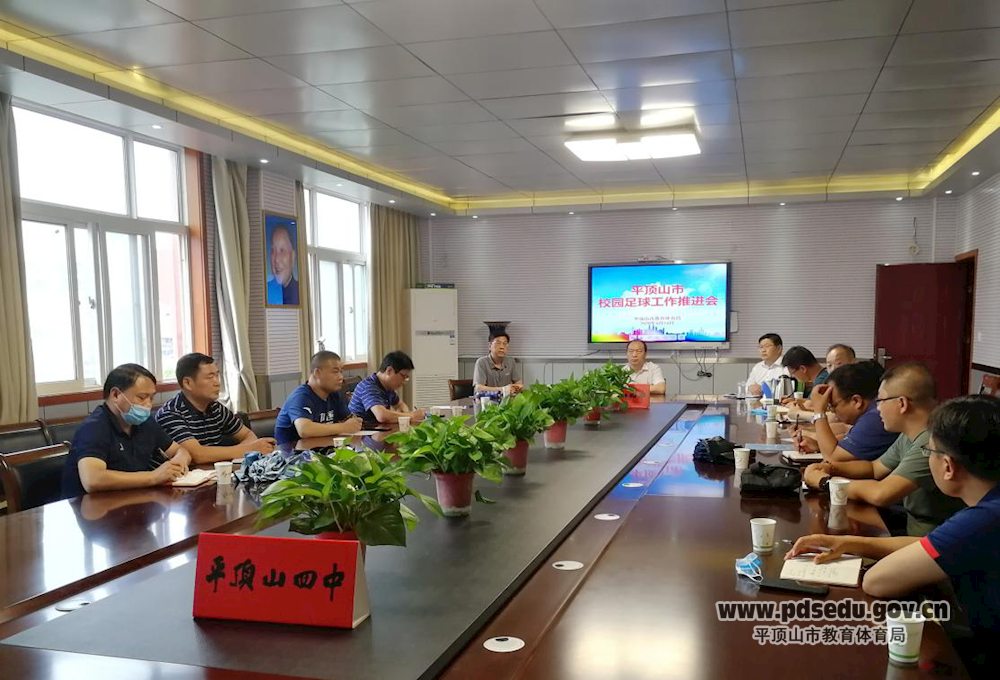 6月16日下午,平顶山市校园足球工作推进会在市四中召开。市教体局党组成员、副调研员李俊峰,体卫艺科科长袁朝军,竞赛科科长齐屹,新华区、湛河区、卫东区主管体育工作的各位股长,部分学校的校长及足球教练参加会议。会议由袁朝军主持。