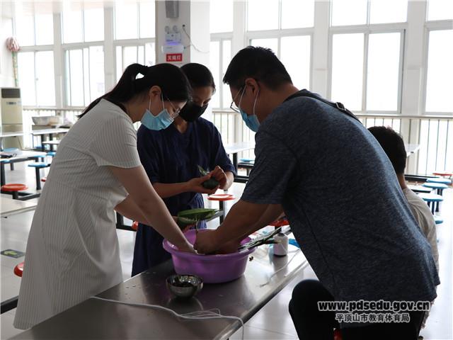 活动现场,副校长许宏举与大家一同包粽子,其乐融融。教职工们劲头十足,拿起手边早已摆好的粽叶,熟练地将它们卷成锥形,向锥形中间放入糯米、蜜枣、花生,封好粽叶,再用白线捆住……现场欢声笑语不断,大家十分享受包粽子的过程。