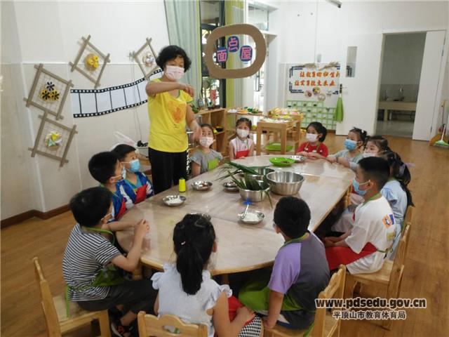 教室里,各班老师引导孩子们通过视频动画来了解端午节的来历及意义,通过老师的讲解,孩子们知道了端午节吃粽子、赛龙舟、挂艾草、挂香包等传统风俗饮食习惯以及屈原的故事,激发了幼儿爱国情感。接下来就开始了本次端午节的重点活动,老师们将准备好的糯米、粽叶等材料分发给各小组,孩子们在老师的引导下,用稚嫩的小手把糯米充实压紧,再用绳一绕、一捆,一个个形态各异的粽子便跃然而出。看着自己动手包的粽子,孩子们露出了开心的笑脸。