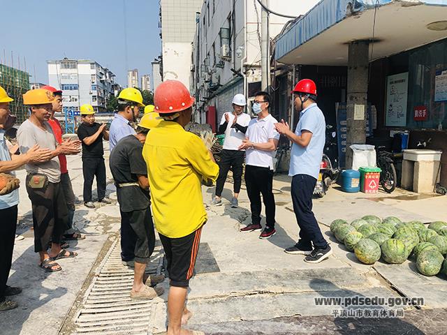 夏日炎炎,工人们从耿保峰校长手中接过清甜可口的西瓜,一个个喜笑颜开。耿保峰校长说,感谢全体施工人员为十四中综合教学楼校安工程做出的贡献,希望大家继续努力,让学生们能够尽早搬进崭新的教学楼。